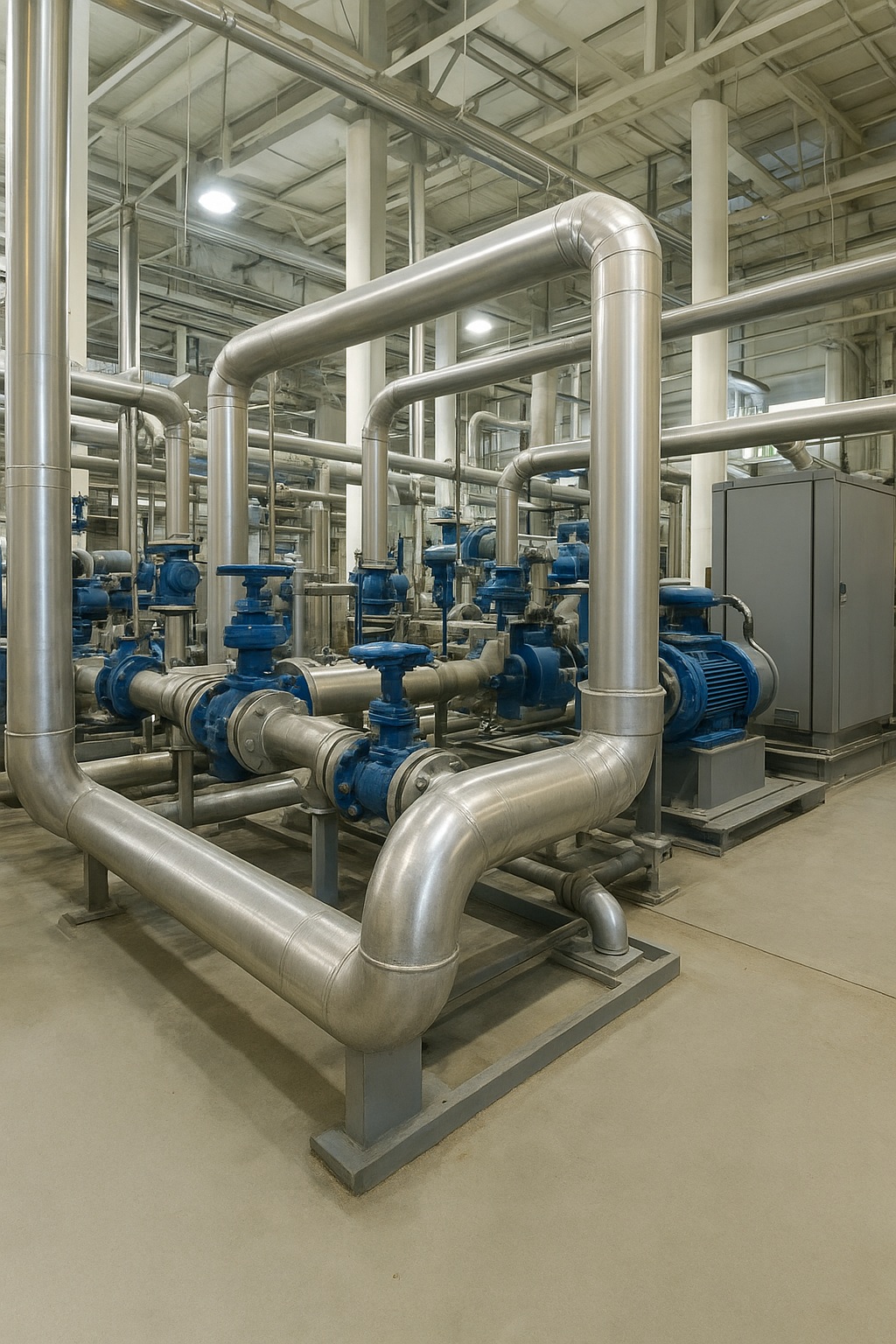 A kivitelezés során kiemelt figyelmet fordítunk a precíz szerelésre, a nagy átmérőjű csőhálózatok megfelelő szigetelésére, valamint az ipari szabványoknak és hatósági előírásoknak való megfelelésre. A projekt zárásaként részletes funkció-vizsgálatokat, üzem- és terheléspróbákat végzünk, hogy garantáljuk a hosszú távú stabil működést. Az ipari környezetben elvárható, hogy a rendszer ne csak megfeleljen a technikai követelményeknek, hanem gazdaságosan is üzemeltethető legyen — kiemelt cél a hatékonyság, a megbízhatóság és a hosszú élettartam.